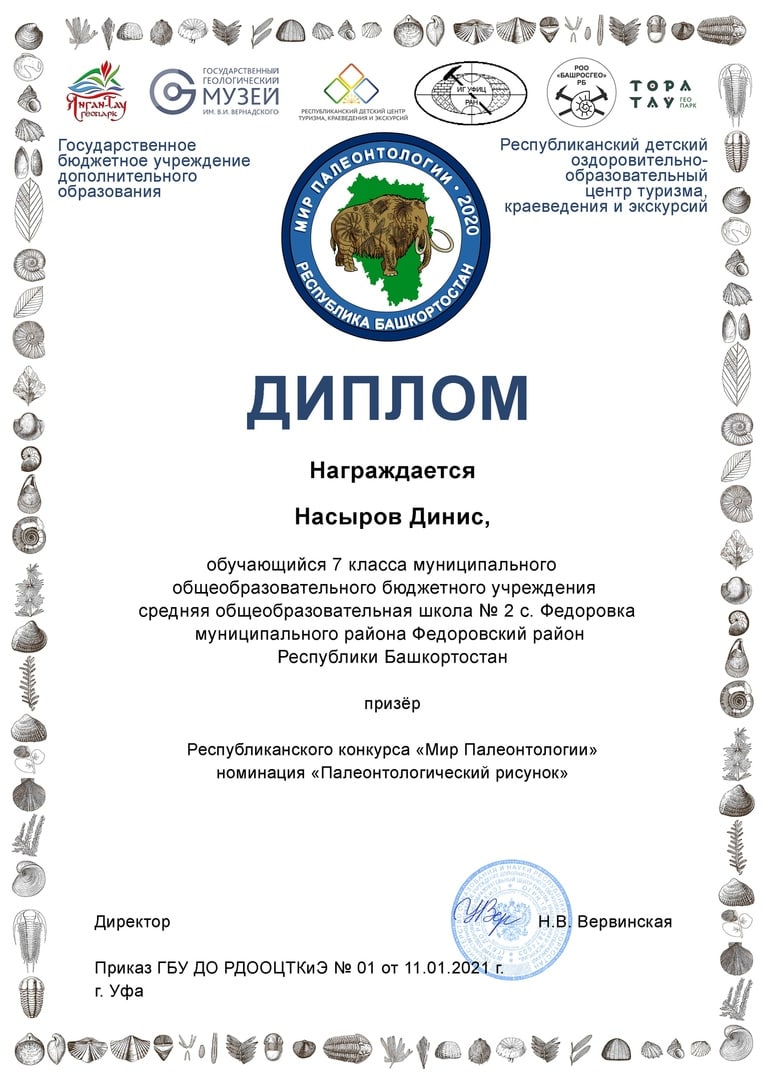 В декабре 2020г ребята нашей школы участвовали в районном конкурсе рисунков " Мир Палеонтологии", где заняли призовые места. Их работы были представлены на одноименный Республиканский конкурс и там они тоже оказались в числе призеров. Насыров Денис и Исянгулова Айлина ученики 7б кл. ( рук Шишкина О.Д. и Горшечникова Л.П.) Мы очень рады за них.